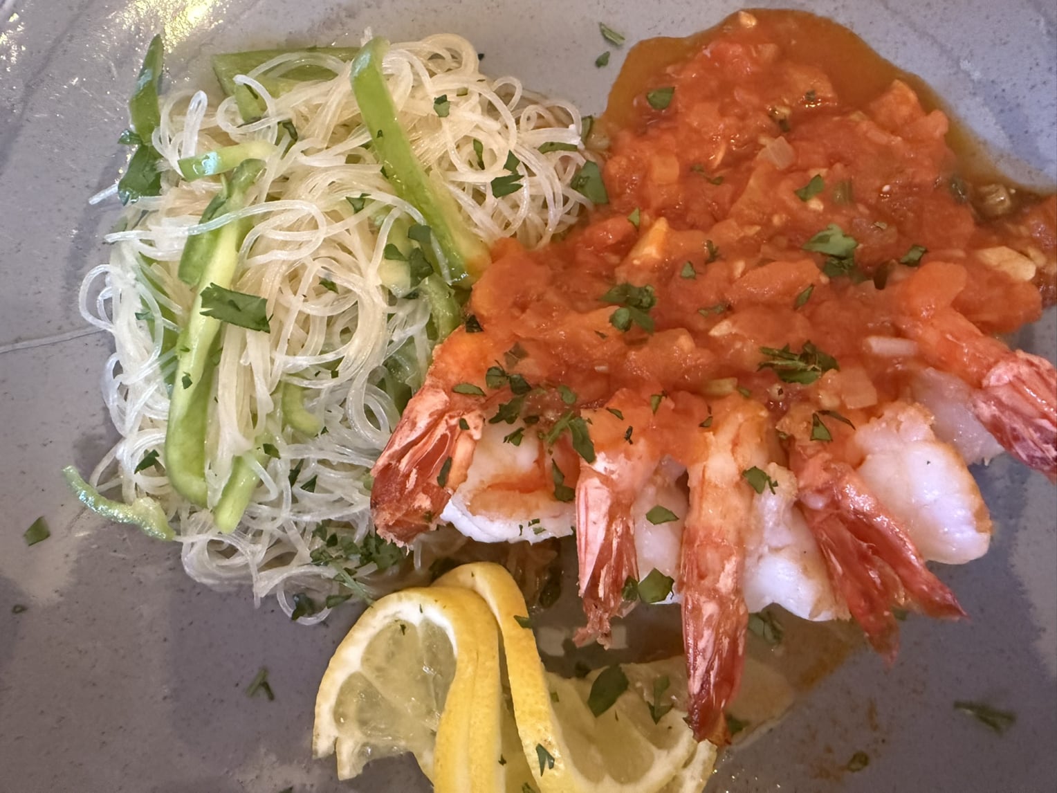 Gebratene Garnelen, Tomatenragout auf buntem Glasnudelsalat | 17,5