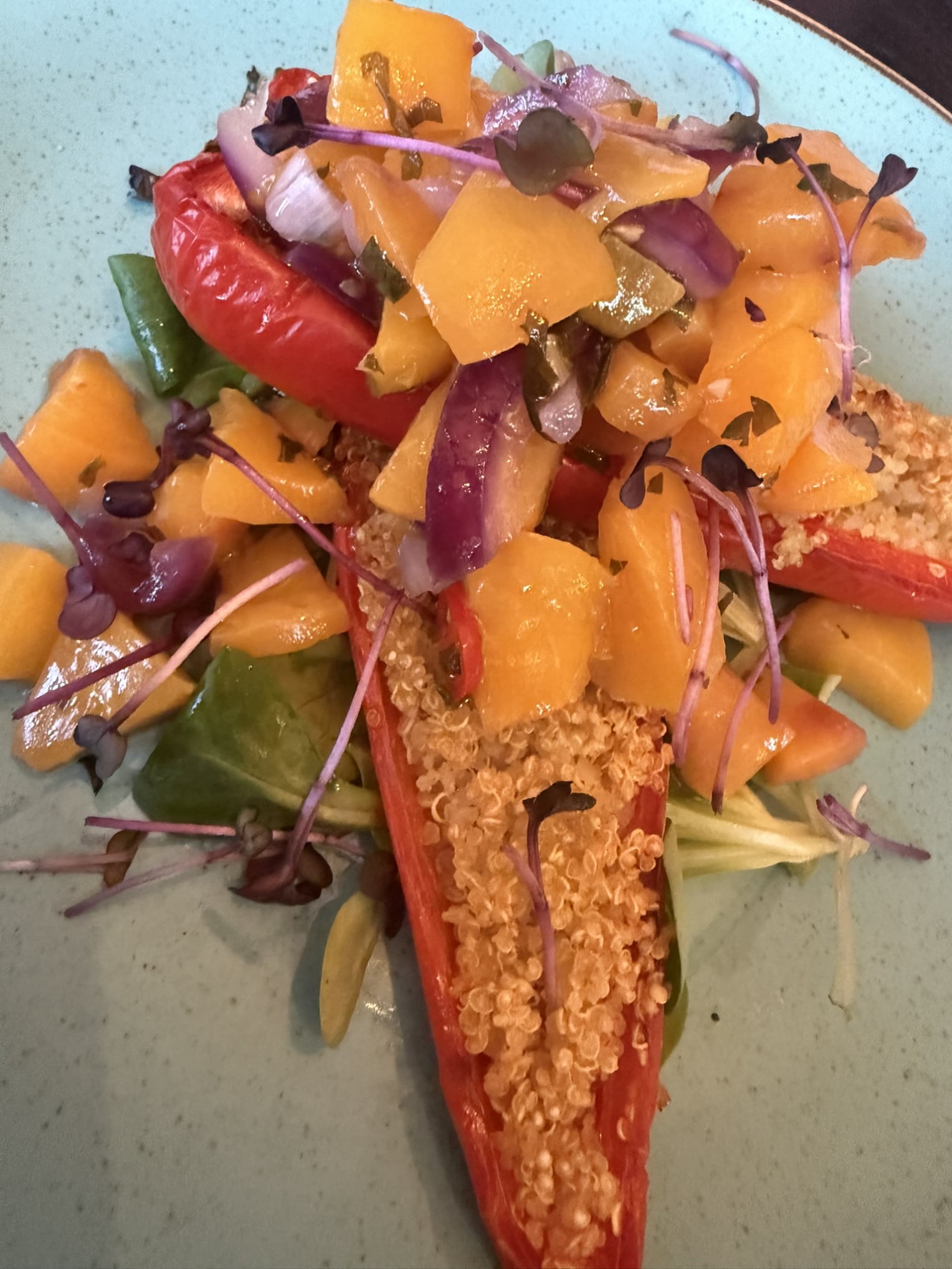 Mit Quinoa gefüllte Spitzpaprika, Chili‑Pfirsich‑Salsa | 15,5